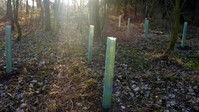 Aufgrund der motivierenden Entwicklung der bereits in den Vorjahren im NABU-Wald "Hölle" ausgepflanzten Flatterulmen bekamen diese nochmals Verstärkung: 17 junge Ulmen wurden im Rahmen eines kleinen Frühjahrs-Arbeitseinsatzes gepflanzt und mit Verbiss- und Fegeschutz versehen. Die Ulmen stehen unmittelbar neben dem alten Mutterbaum, von dem die Saat für die Anzucht der Bäumchen stammt.