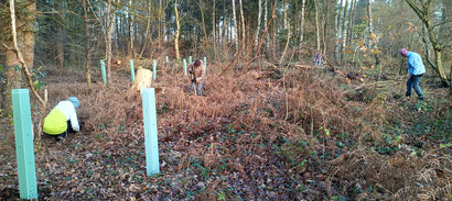 Beim letzten Arbeitseinsatz im Jahr 2025 pflanzten wir rund 60 heimische Wildgehölze, um am Rand unseres Waldes 'Hölle' einen arten- und strukturreichen Waldrand zu schaffen. Zuvor wurden in dem Streifen entlang des Weges am Südrand des Waldes Sitka-Fichten entnommen. Auf der frei gewordenen Fläche wachsen nun junge Eichen, Bergahorne, Wildbirnen, Vogelkirschen, Haselsträucher, Weißdorn, Wildrosen und einiges mehr. Zum Schutz gegen Wildverbiss und Fegeschäden erhielten die Junggehölze einen Einzelschutz. Diese werden wieder abgebaut, wenn die Sträucher und Bäume so groß sind, dass sie außer Gefahr sind.