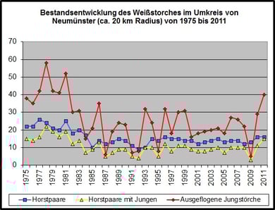Ein „Rekordergebnis“ von 40 jungen Weißstörchen in diesem Jahr um Neumünster kann Peter Hildebrandt vermelden. Im gleich bleibenden Beobachtungsgebiet wurden im Vorjahr immerhin 29, im Jahr 2009 jedoch nur 5 junge Stelzvögel groß. Ein besseres Ergebnis gab es zuletzt vor genau 30 Jahren, 1981, mit 52 ausgeflogenen Jungvögeln.