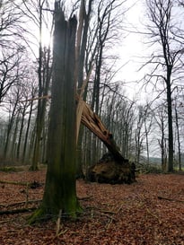 Auf recht spektakuläre Weise hat Sturm "Zeynep" im Buchenaltbestand unseres "Fledermauswaldes" für neue zukünftige Totholzlebensräume z. B. für Insekten und Spechte gesorgt: Eine Altbuche ist