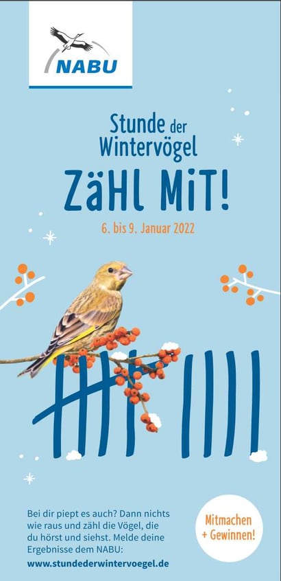 Der NABU ruft wieder zur bundesweiten Mitmach-Aktion "Stunde der Wintervögel" auf. Alle Informationen über die Aktion, die Teilnahme und zur Meldung Ihrer Beobachtungen gibt es hier - oder auf das Bild klicken!