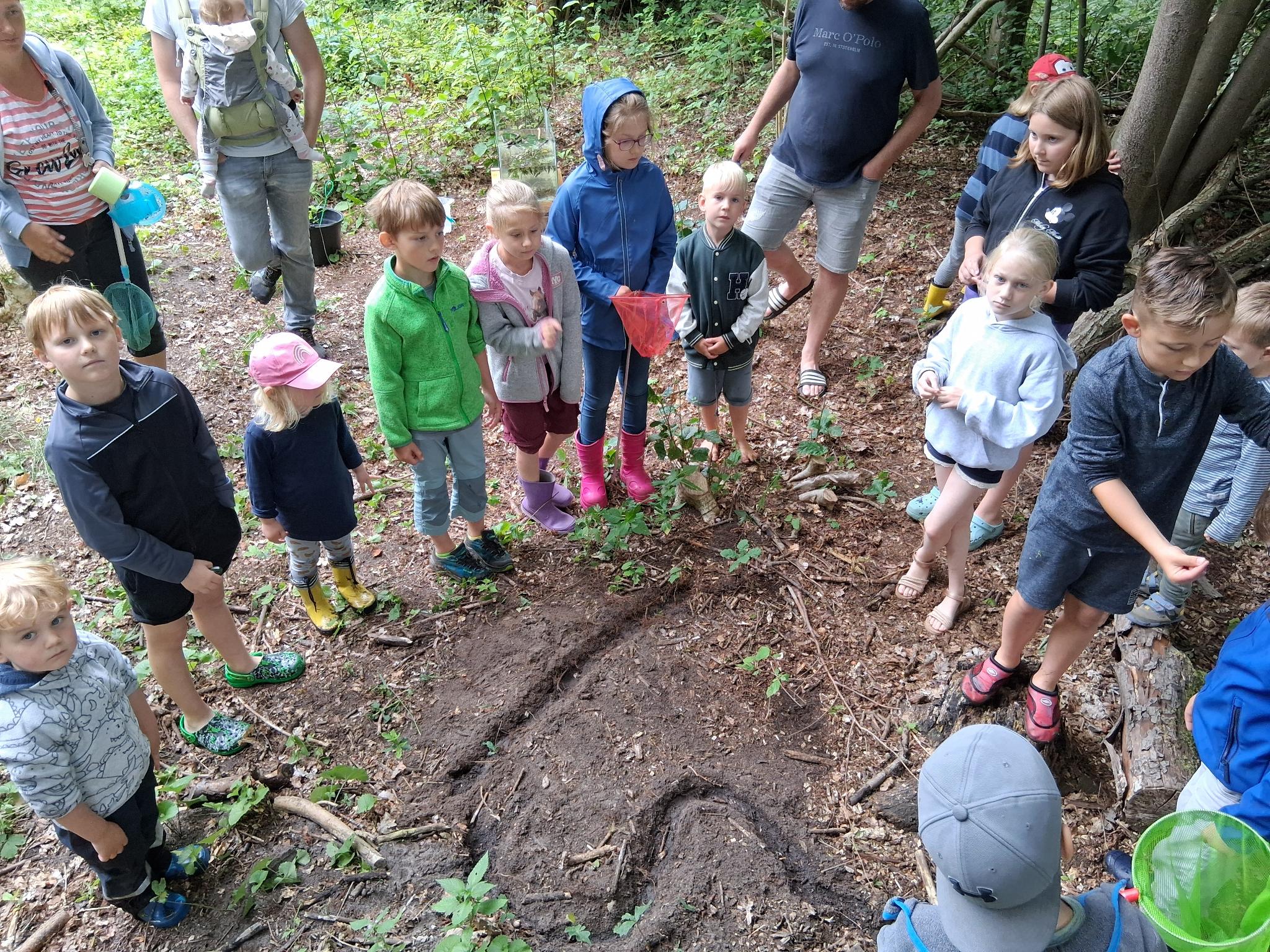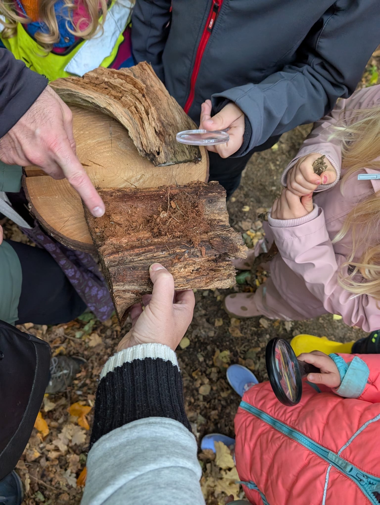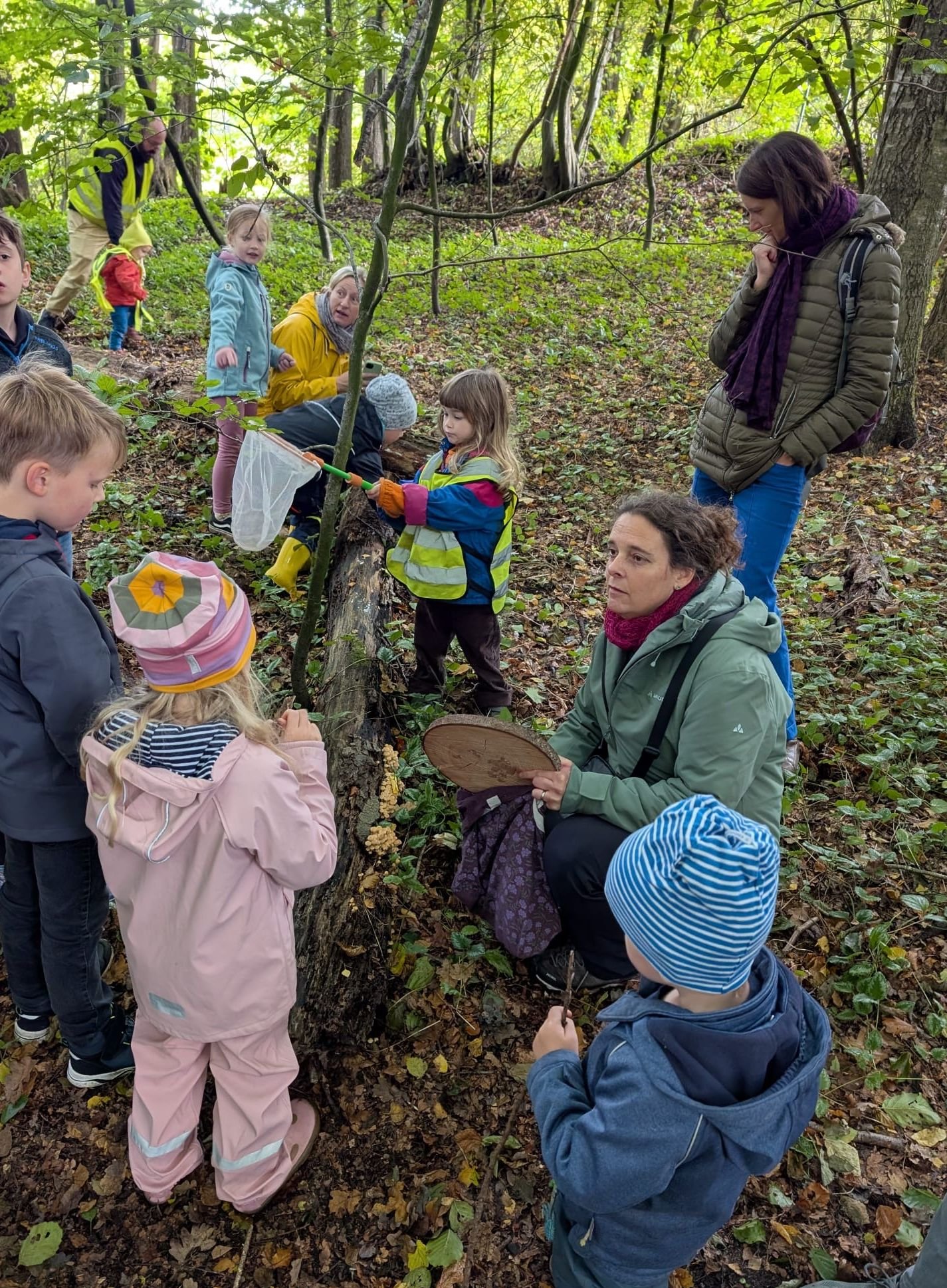 Was das eigentlich ist und wie es dazu kommen kann, dass das Holz nicht mehr lebt und warum das ein ganz natürlicher Prozess ist, haben wir uns angeschaut. 16 Kinder und ihre Begleitpersonen betrachten das Totholz genauer und merken schnell, dass es nicht nur aus abgestorbenem Holz besteht, sondern dass darin das Leben tobt!