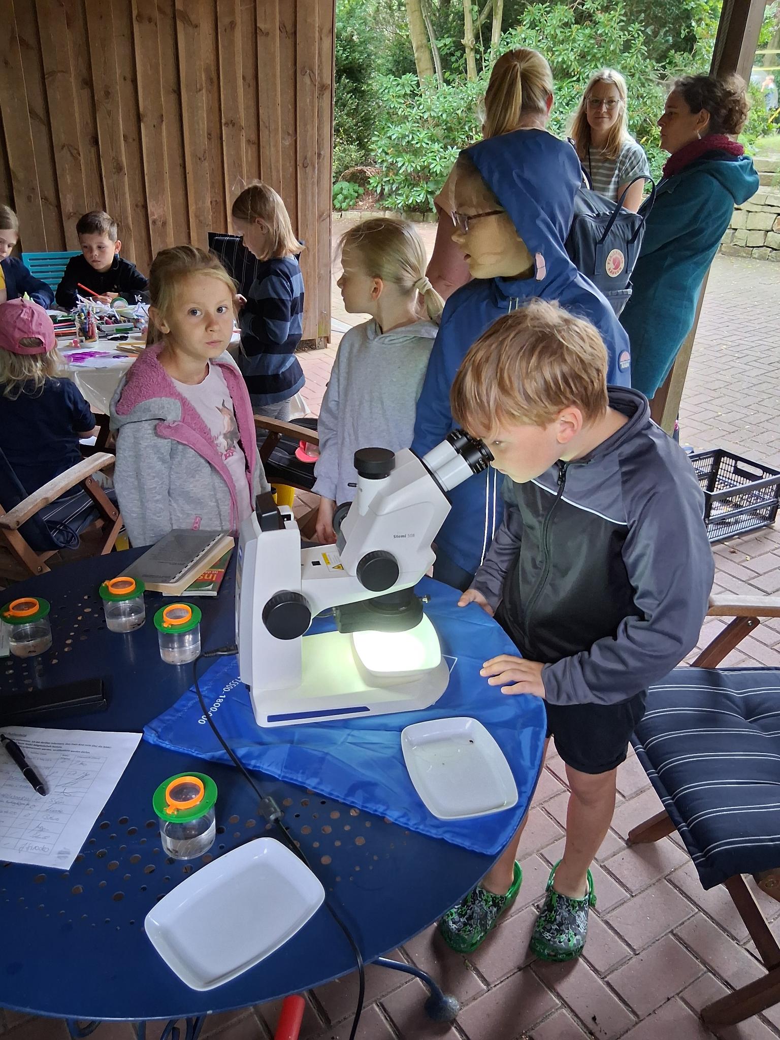 benötigten wir einen wettergeschützten Bereich und Strom. An Station 2 konnten die Kinder mit Hilfe einer Stereolupe ihren "Fang" mit bis zu 50-facher Vergrößerung genauestens betrachten. Ein