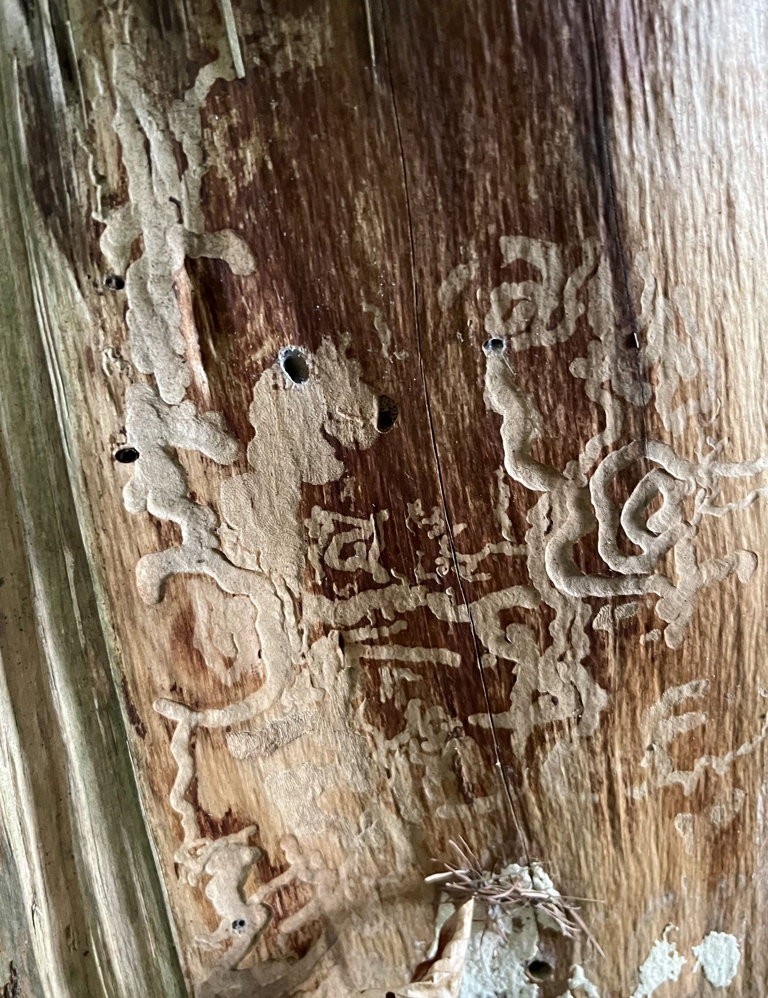 Als wir Näheres über den Unterschied zwischen Moosen und Flechten erfahren, nehmen wir die filigrane Struktur der Oberflächen und ihre Farbenpracht in Grau-, Grün- und Gelbtönen wahr. Auf ihre Art wunderschön anzusehen sind auch die mäanderartigen Spuren der Larven holzverwertender Insekten, die sich über die gesamten Unterseiten loser Rindenstücke ziehen können.