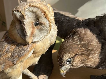 Wir konnten uns zwei historische Präparate ausleihen und uns so einen Mäusebussard mit ausgebreiteten Schwingen und eine Schleiereule mit ihrem herzförmigen Gesicht ganz aus der Nähe ansehen.
